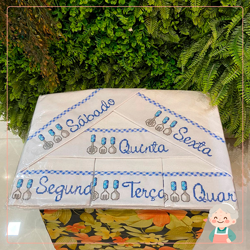 Pano de Prato Semaninha Ponto Cruz Talheres Azul - 7 Peças